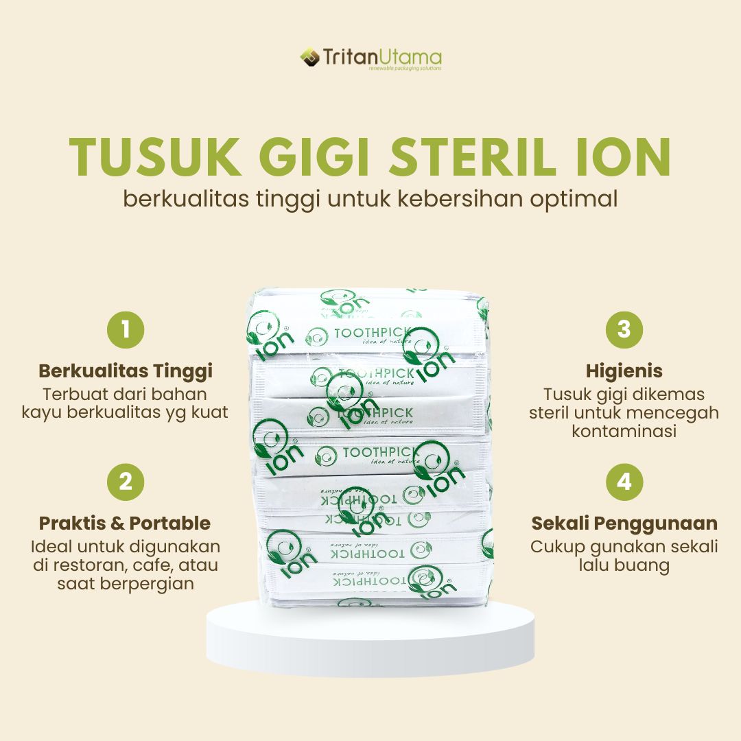 Tusuk gigi merk ION dirancang sebagai perlengkapan penunjang kebersihan yang praktis dan aman digunakan, baik untuk kebutuhan HOREKA, usaha kuliner, rumah tangga, maupun distributor perlengkapan F&B. Produk ini dibuat untuk mendukung standar kebersihan dan kenyamanan setelah makan, tanpa mengorbankan kualitas.